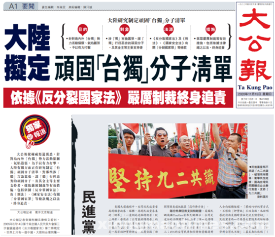 香港《大公报》15日援引“权威渠道”的消息说,大陆有关方面正在研究制定“台独”顽固分子清单,将对他们终身追责,最高可判无期徒刑。这两天大陆媒体纷纷跟进报道,一些还发表社评或其他分析…