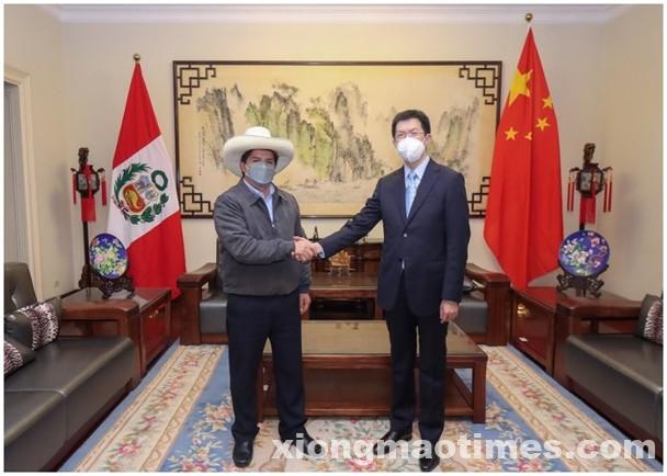 卡斯蒂洛(左)与梁宇(右)会面。 【熊猫时报讯】宣称胜出秘鲁总统选举的左派候选人卡斯蒂洛(Pedro Castillo)周四(15日)与中国驻秘鲁大使会面,是选举以来他首个到访的外…