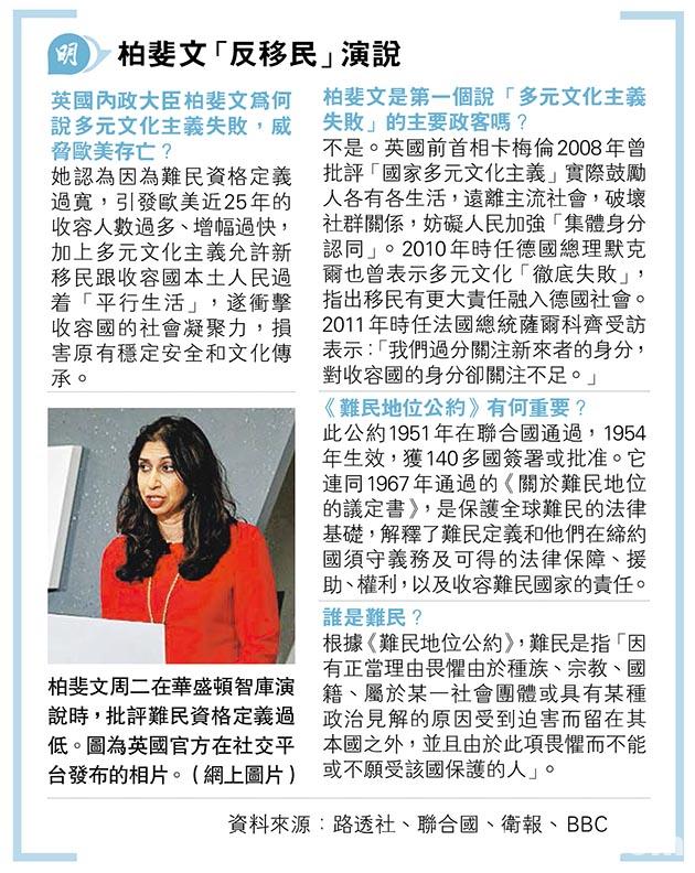 【今日点击】英國內政大臣柏斐文周二(26日)在美國演說時語出驚人,批評聯合國《難民地位公約》不合時宜,庇護門檻過低導致移民失控,而歐美長期奉行的多元文化主義,助長增長過急的新移民人…