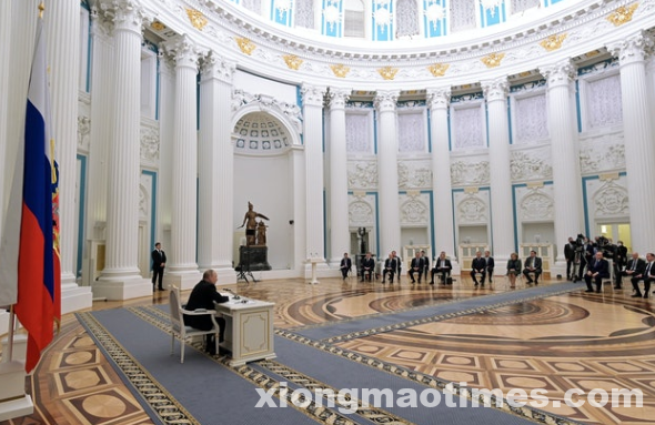 圖為2月21日,俄羅斯莫斯科,普京在克里姆林宮進行國家安全會議。(AP)