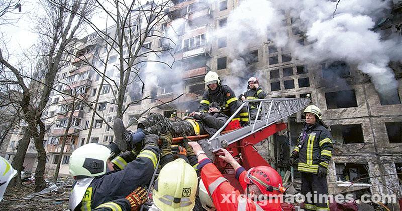 圖 – 基輔奧博隆區一棟住宅大廈昨被俄軍空襲起火,消防員到場協助居民逃出火場(法新社)