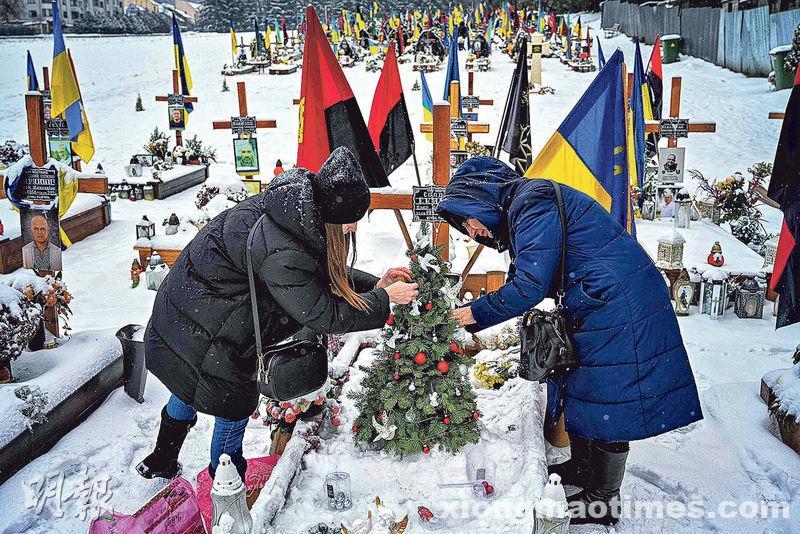 圖 – 在俄軍侵略下,烏克蘭許多軍人陣亡。聖誕臨近,西部城市利沃夫一對婆媳為她們作戰陣亡的兒子、丈夫裝飾墓頭應節。(法新社)