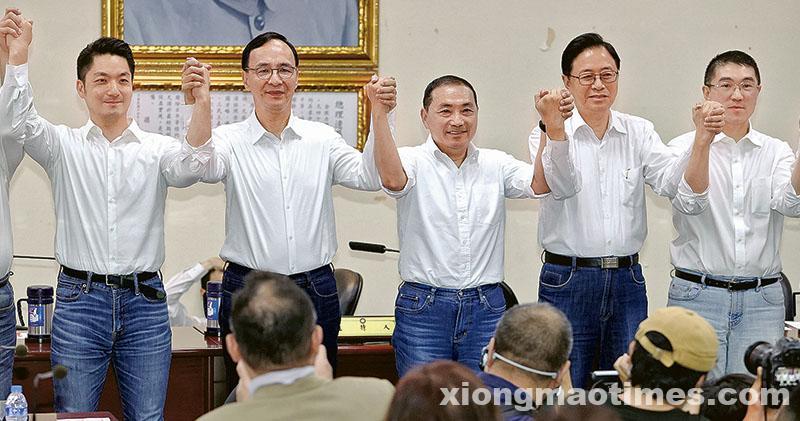 圖 – 國民黨宣布徵召新北市長侯友宜參選2024“總統”,(左起)台北市長蔣萬安、國民黨主席朱立倫、侯友宜、桃園市長張善政、基隆市長謝國樑等人也都出席造勢,共同高舉雙手高喊「當選」。