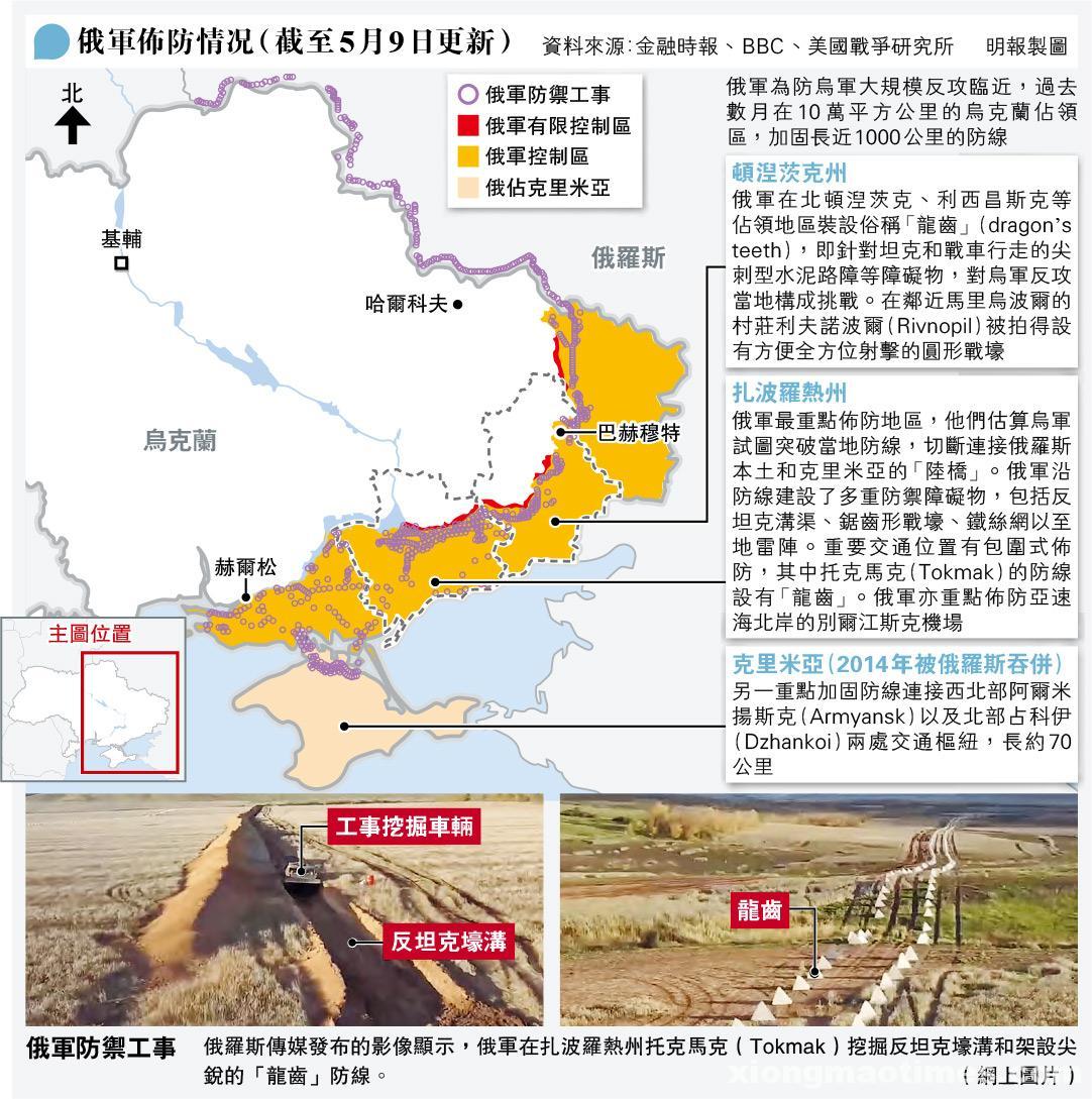 英國廣播公司(BBC)上月底表示,俄軍最少已在克里米亞西岸和烏南扎波羅熱州3處可見地方,設置多重防線陷阱。其中美國衛星影像公司行星實驗室(Planet Labs)5月3日的影像顯示,俄軍在扎波羅熱州托克馬克(Tokmak)發炮點前550米範圍內,便佈置了3道分別由反坦克壕溝、俗稱「龍齒」(dragon’s teeth)的尖刺狀混凝土障礙物,以及鋸齒形戰壕組成的防線。