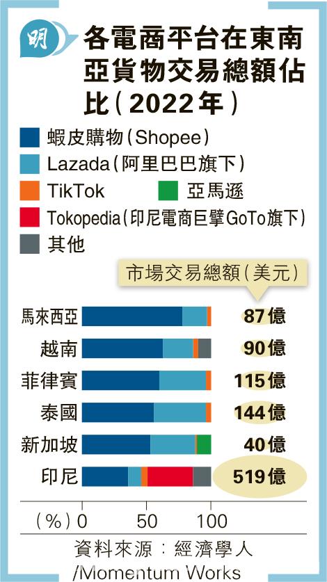 印尼電子商務市場主要由本土科企GoTo旗下的Tokopedia和兩間中國企業——蝦皮購物和阿里巴巴旗下Lazada所主導。TikTok前年率先在印尼引進TikTok Shop。Momentum Works數據顯示去年印尼電子商務交易額達到近520億美元,其中5%交易在TikTok Shop進行。