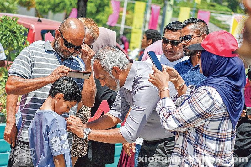 圖 – 馬爾代夫周六舉行總統選舉第二輪投票,反對派候選人穆伊祖(中)周三出席競選活動時,在一名男孩的襯衫上簽名。(法新社)