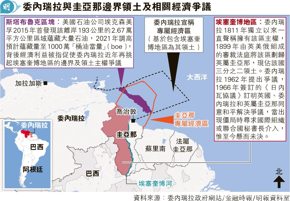 圭亞那今年8月起拍賣上述油田開採權後,觸動馬杜羅及其政府神經,他上月20日提出12月3日以公投回應埃克森美孚、美軍南方司令部,以及圭亞那總統阿里(Irfaan Ali)的「挑釁」。圭亞那上月緊急入稟ICJ,要求叫停委內瑞拉公投,指其對該國構成「存亡」威脅。ICJ上周五命令委內瑞拉就改變圭亞那「管理和行使」對埃塞奎博地區控制「保持克制」。一向支持圭亞那的美國上周派軍方代表團訪問當地,討論「提高兩國軍事準備,以應對安全威脅」。委、圭兩國以南的巴西亦加強北部的軍事部署。