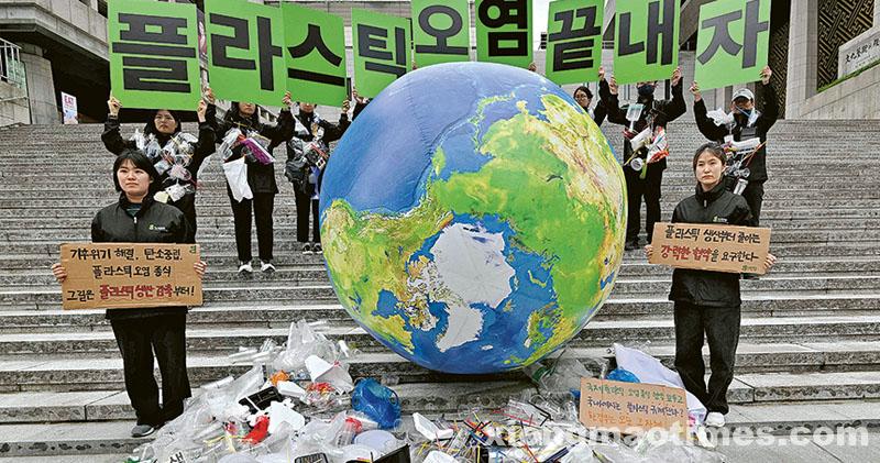 圖- 周一為世界地球日,在韓國首爾,有環保人士展示一個堆滿塑膠垃圾的地球圖案氣球,並高舉寫有「讓我們結束塑膠污染」的標語牌,呼籲人們減少使用塑膠。(法新社)
