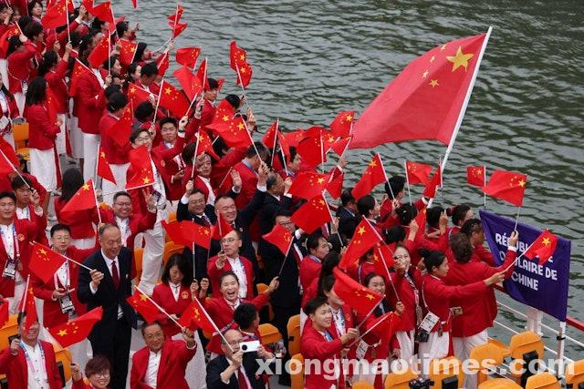 一如既往首先出場為奧運發源地希臘代表團,由NBA球星「字母哥」安迪度高安普任持旗手,選手們乘着開篷遊船穿過添上奧運雕刻的奧斯特利茨橋後在塞納河登場,緊接為難民奧運代表隊;之後按法文名字順序出場,各隊船隻並非統一大小,如南非與阿爾巴尼亞及阿爾及利亞隊共用同一遊船亮相;中國隊在乒乓星將馬龍及韻律泳將馮雨任持旗手,在第41隊代表團登場,與加拿大、喀麥隆、中非共和國及智利代表團同船;英國隊在第72隊出場,「跳水王子」戴利聯同35歲賽艇女將高化擔任持旗手。