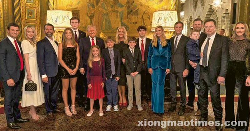 圖 – 科技富豪馬斯克(右二)日前攜子到佛羅里達州,與他支持的美國總統選舉當選人特朗普(左六)一家合照。(網上圖片)