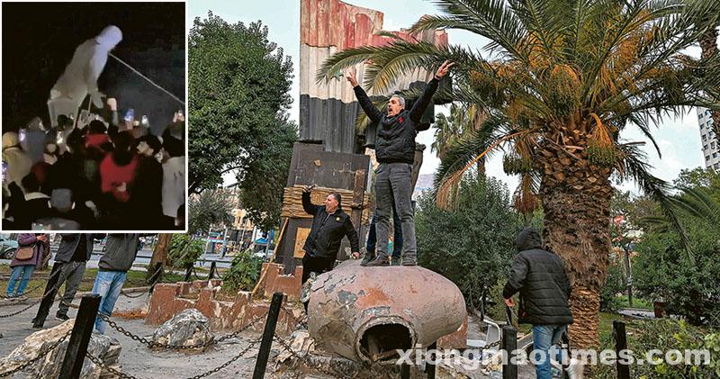 圖- 大馬士革民眾昨推倒一座巴沙爾父親哈菲茲.阿薩德的雕像,有人站到其上振臂歡呼。在敘利亞第三大城市霍姆斯,昨天亦有民眾合力拉倒一尊阿薩德的雕像(小圖,路透社)。(法新社)