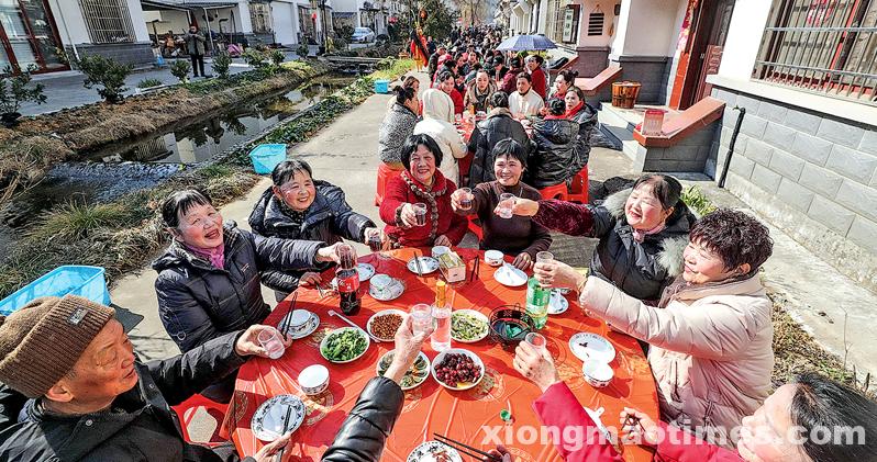 圖- 農曆新年將至,全國多地政府推動節儉過年、抵制濫辦酒席。圖為浙江建德市蓮花鎮戴家村「百家宴」過大年系列活動拉開帷幕,村民共同品嘗簡單的「百家宴」迎新春。