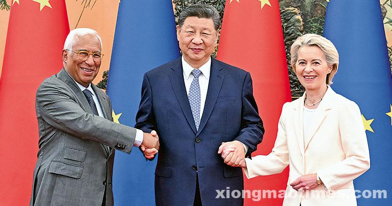 圖 – 國家主席習近平(中)昨在北京人民大會堂會見歐洲理事會主席科斯塔(左)、歐盟委員會主席馮德萊恩(右)時說,希望歐方保持貿易和投資市場開放。馮德萊恩強調必須處理貿易失衡問題,科斯塔則促北京干預俄烏戰爭。(新華社)