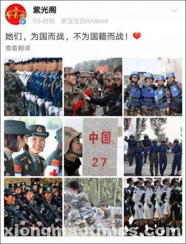 官媒《紫光閣》的微博帖文發布了一組中國女兵的圖片,並配文:「她們,為國而戰,不為國籍而戰。」中國空軍的官方微博帳號也發布一系列女傘兵訓練宣傳照,配圖帖文也意味深長:「跳就完了,別整那些花裡胡哨的。」頗有嘲諷高天才炒作的意味。