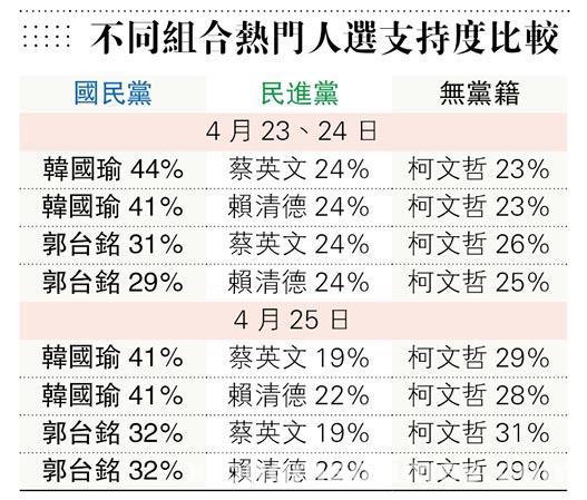 【熊貓時報訊】台灣明年1月將選出“總統”,根據台灣最新民調顯示,國民黨籍的高雄市長韓國瑜穩勝現任“總統”、民進黨籍的蔡英文,以及無黨派的台北市長柯文哲。柯仍未表態參選。