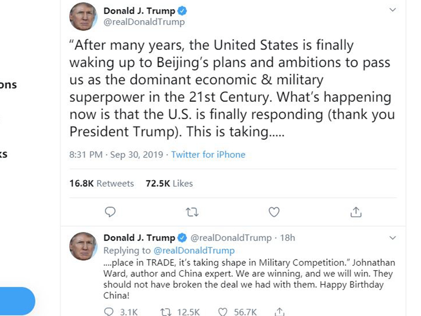 特朗普的两段式推特“祝福”以引用中国问题专家、作家沃德(Johnathan Ward)的话开场:“多年后,美国终于醒悟过来,意识到北京的计划和抱负,(中国)要超越我们,成为21世纪主导性的经济和军事超级大国。现在正在发生的事,是美国终于做出了回应(感谢你,特朗普)。这是从贸易开始的,并已在军事竞争中初见端倪。”