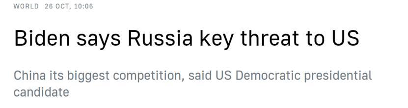 记者问这位前副总统,他认为哪个国家对美国最危险。拜登回答说:“就破坏我们的安全和联盟而言,我认为当前对美国的最大威胁是俄罗斯。其次,我认为中国是最大的竞争对手。并且还取决于我们会如何处理,是竞争对手抑或处于更严重的对峙状态。”