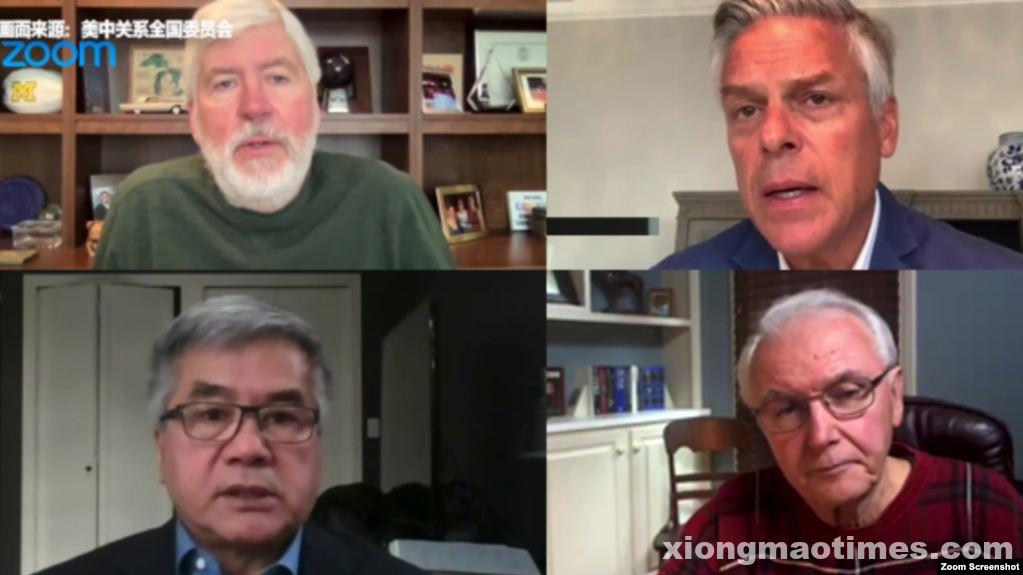 洪博培、骆家辉、霍尔顿、斯奈德四位美国前州长参加美中关系全国委员会线上讨论截图