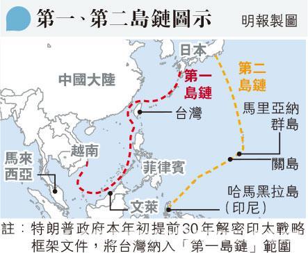第一島鏈一般意指包括台灣、沖繩和菲律賓等接近中國大陸的島嶼,報道形容中國視之為美軍首道防線,其「反介入/區域拒止」(anti-access/area denial)戰略尋求將美軍推出東海和南海的第一島鏈以外。第二島鏈由日本東南部去到關島(美國屬地),南至印尼,報道指中方尋求限制美軍接近這道西太平洋防線,將令美軍以往依賴海軍和空軍的戰略難再奏效。